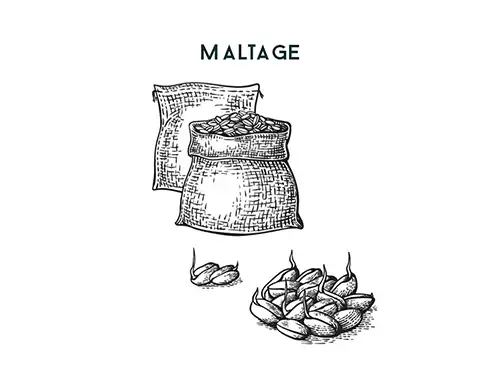 cette étape consiste à faire germer le malt pour convertir l'amidon en sucres fermentescibles. Les grains sont trempés dans de l'eau pour amorcer la germination, puis séchés pour arrêter le processus.